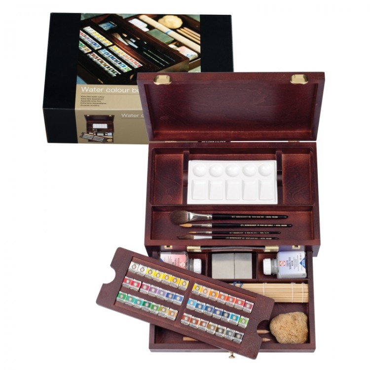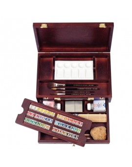 Contenu: 42 godets (108 – 112 – 254 – 224 – 231 – 238 – 244 – 246 – 247 – 248 – 264 – 311 – 321 – 325 – 336 – 349 – 366 – 371 – 377 – 409 – 410 – 411 – 416 – 506 – 507 – 508 – 512 – 522 – 532 – 533 – 535 – 576 – 585 – 615 – 620 – 623 – 633 – 645 – 662 – 675 – 701 – 708), 2 flacons 75 ml auxiliaires ( 1 Cache liquide Talens, 1 Vernis pour aquarelle Talens mat) 4 pinceaux, série 110 nos. 4 et 12 en poils de martre rouge, série 132 no. 6 et série 136 no. 2 (petit gris pur, poils d’écureuil), 1 plateau mélangeur en porcelaine, 3 crayons esquisses, gomme malléable, 1 petite natte pour pinceaux, 1 petite éponge, flacon pour eau en métal et 1 dépliant.
